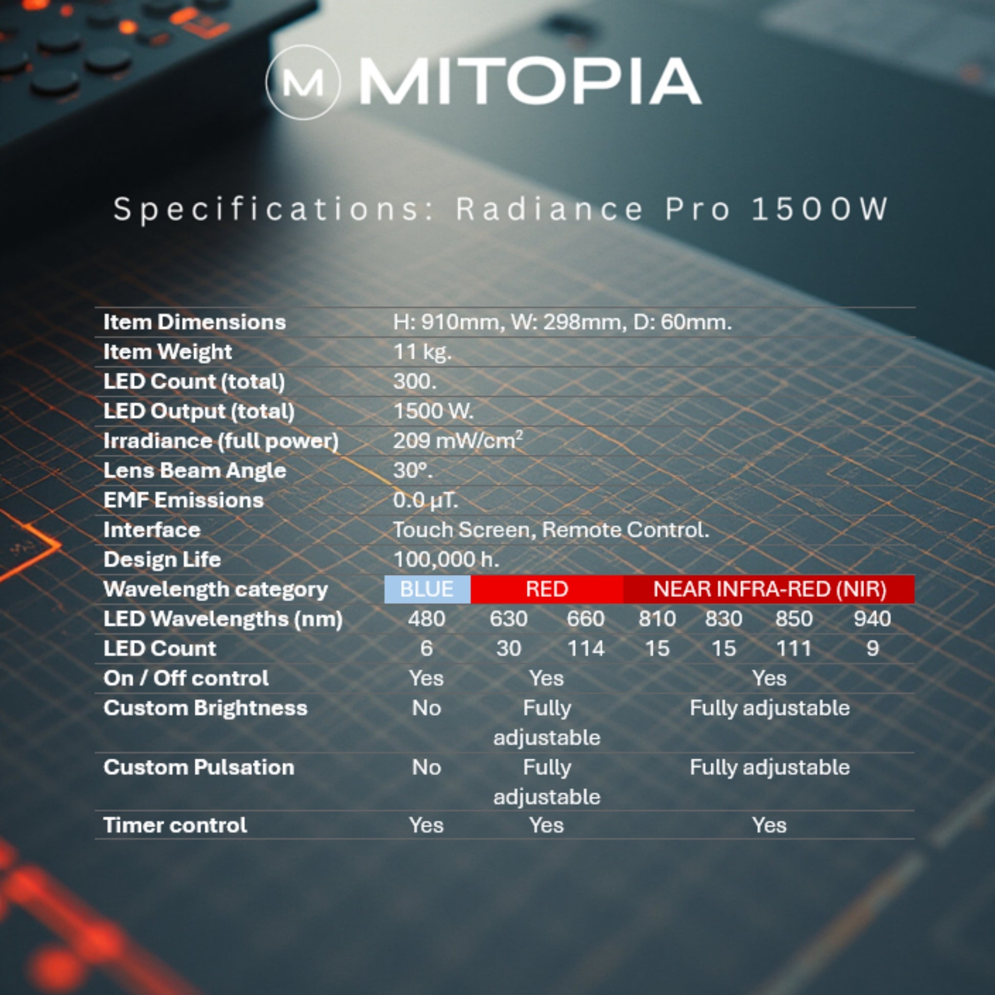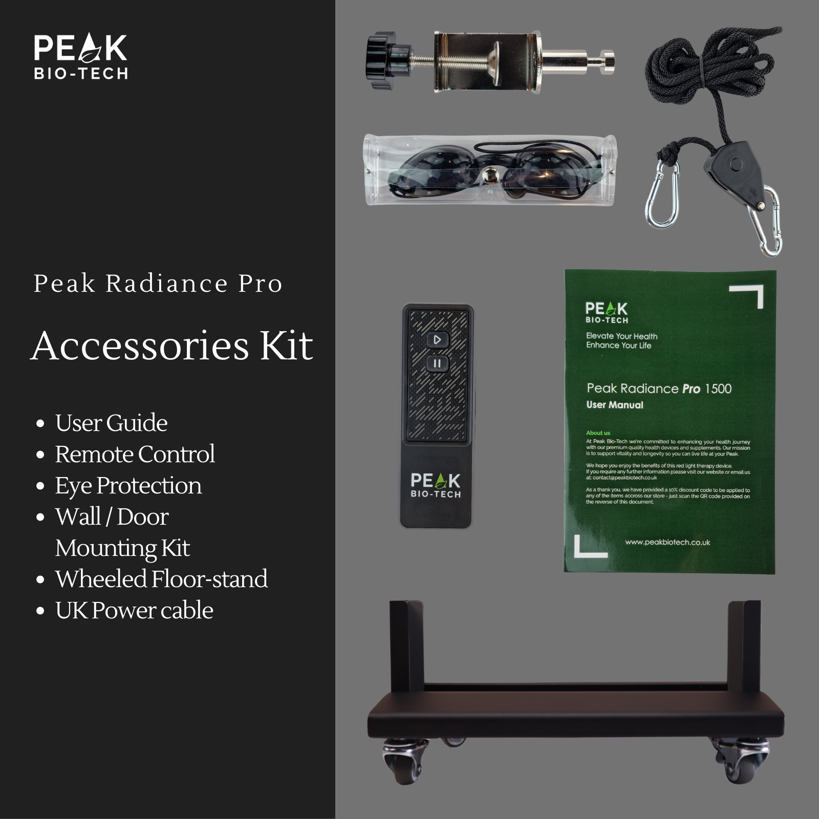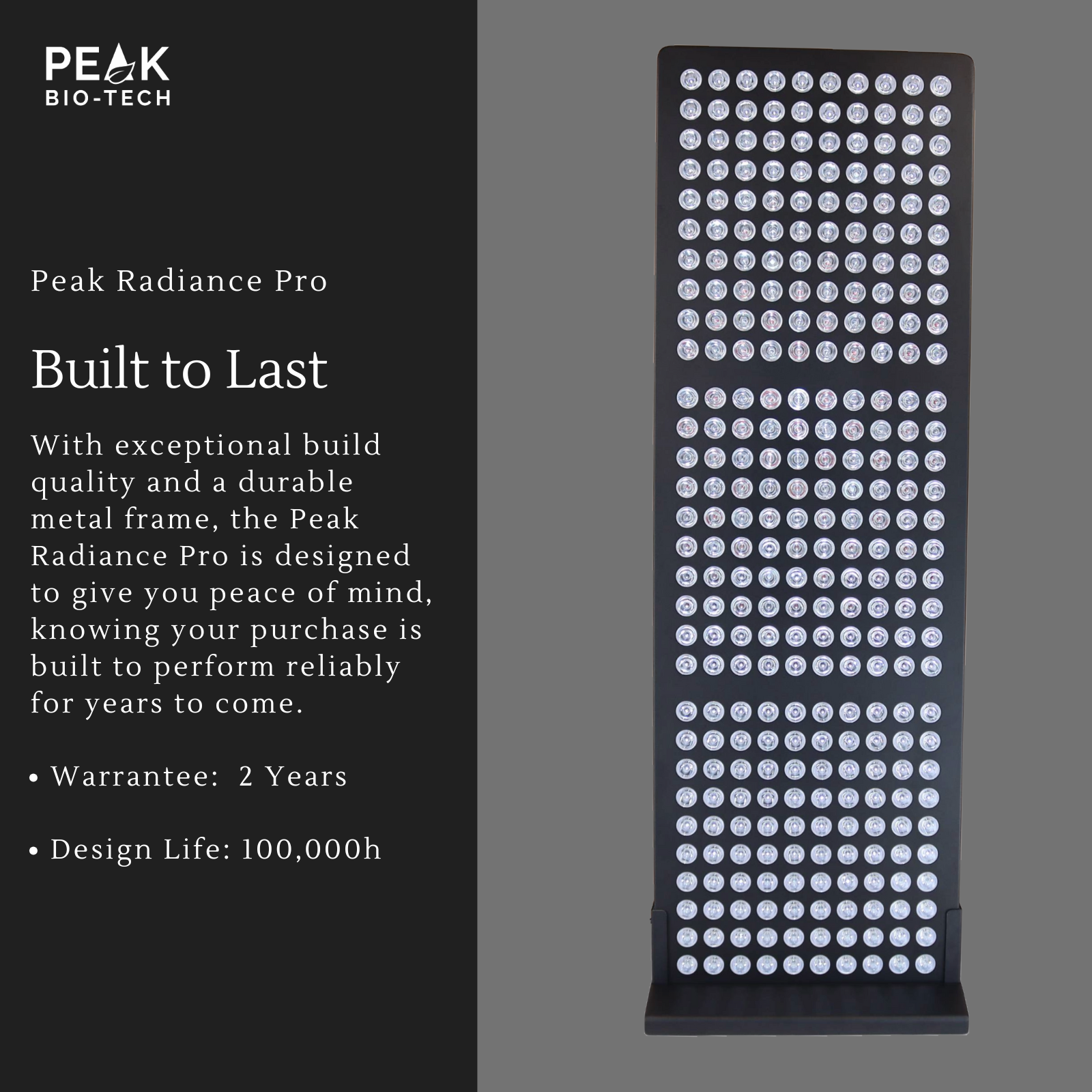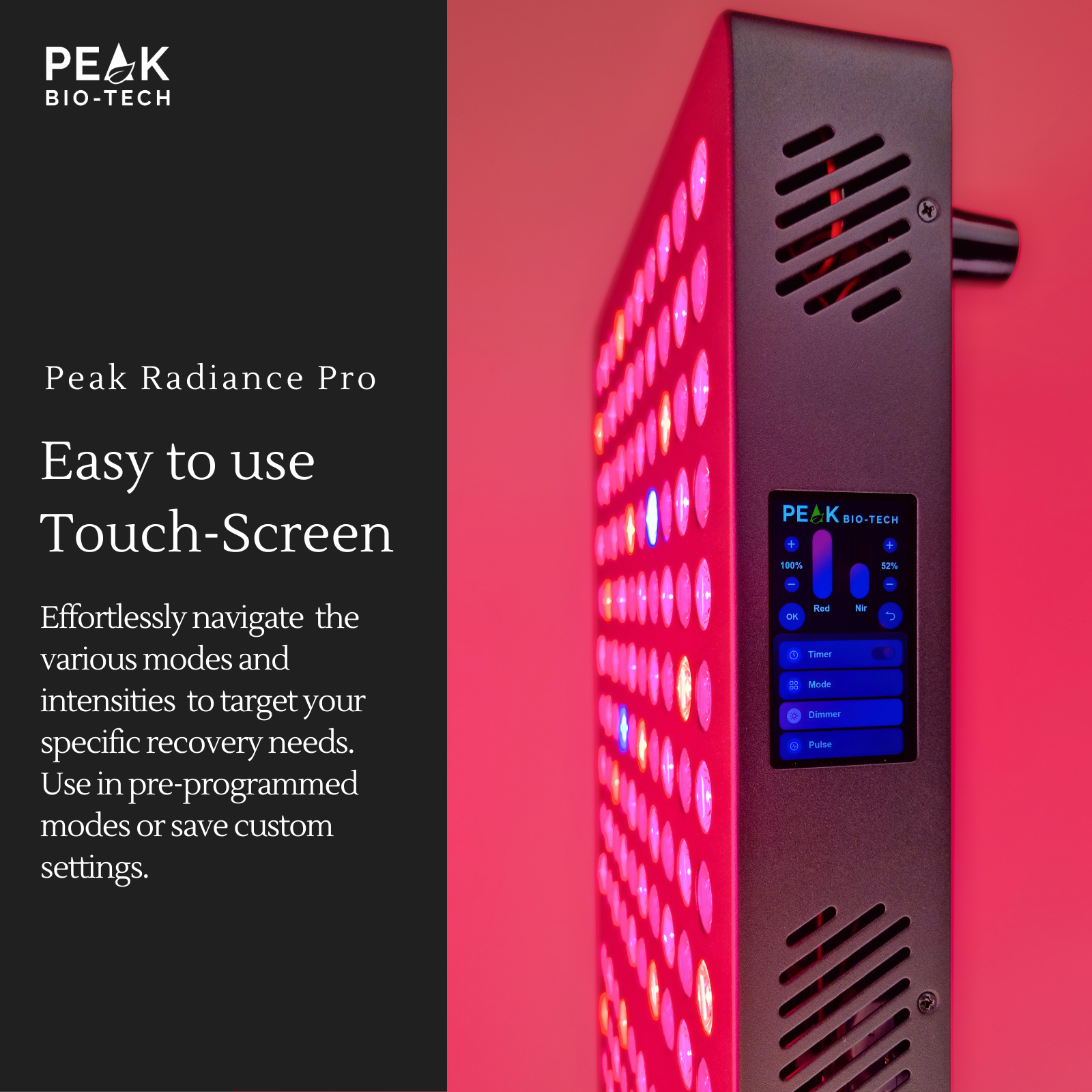 The Peak Radiance Pro features dual-chip high precision LEDs emitting 1500W at therapeutic wavelengths. The devices design ensures consistent performance across all dimming and pulsation settings to provide clinical grade red light therapy in the comfort of your home.