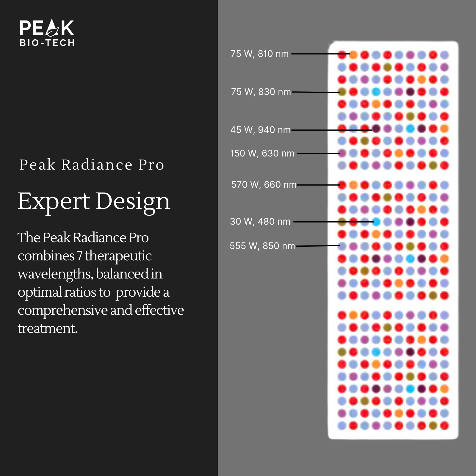The Peak Radiance Pro is thoughtfully designed with a balanced configuration of 7 therapeutic wavelengths, delivering a comprehensive and synergistic treatment. Each wavelength is carefully selected to target specific therapeutic benefits, ensuring optimal results for skin health, pain relief, cellular regeneration, and overall well-being.